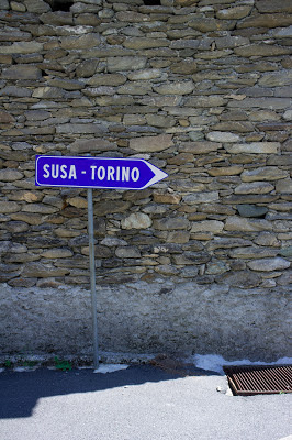 Nous ne traînons pas. Nous remontons sur nos motos en direction de la frontière italienne (c'est la première fois que j'emmène ma moto à l'étranger: champagne!). Là, tout change. Les nuages se font plus épars, le soleil commence à nous réchauffer. Nous prenons le long ruban de bitume qui serpente vers Suze (Suza en italien. Donc rien à voir avec la boisson, bande d'ivrognes!). La route est bonne car elle a été refaite récemment pour le Giro (tour cycliste d'Italie). Nous avons envie d'accélérer pour profiter de la route, mais les nombreux véhicules qui descendent en même temps que nous calment notre enthousiasme.